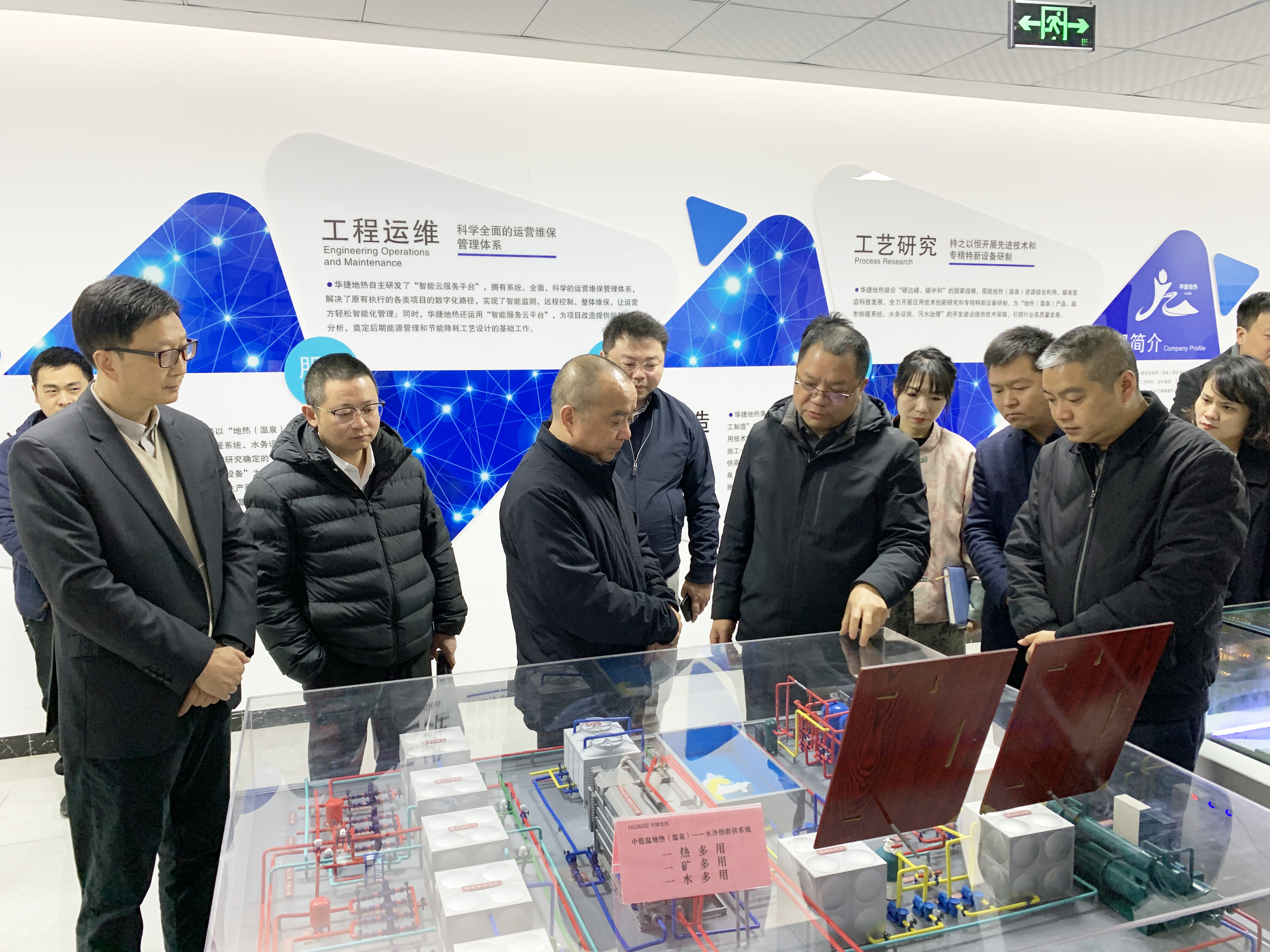 考察组先后参观了华捷地热研发成果展厅、智能化控制区和温泉康养设备产品区,详细了解了公司自主研发的水冷热联供集成系统、温泉一水多用智能设备、温泉专用运输车等专利工艺、设备。此外,技术人员现场演示了智能云服务平台,展示了其对地热温泉资源的全流程数字化管理能力。水富市委书记施华松详细询问了各项工艺、设备、产品的研发历程和应用场景,对公司在技术创新方面取得的成果给予高度评价。