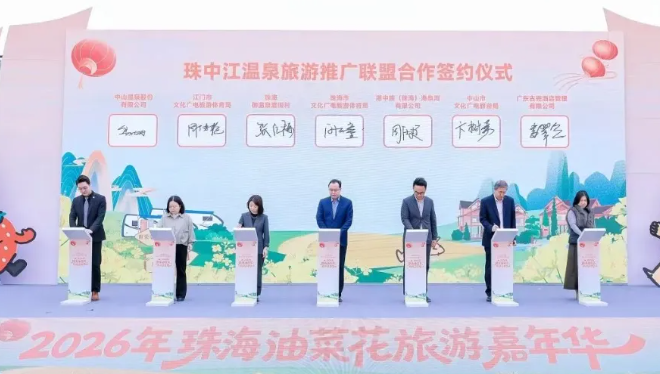 2月7日,在珠海市文化广电旅游体育局主办的 2026 年珠海油菜花旅游嘉年华开幕式上,珠中江温泉旅游推广联盟正式宣告成立。联盟的成立是贯彻落实《珠江口西岸都市圈一体化建设三年行动方案(2024-2026年)》的重要举措,也是继2025年三地联合举办“万亩油菜花田嘉年华”后,对区域文旅合作模式的进一步深化。