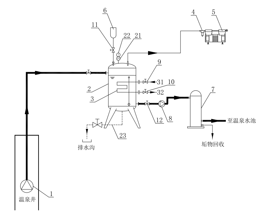 本方法通过实现真空容器负压运行,以促进真空容器内二氧化碳的逸出,从而大大提高了温泉水中碳酸钙垢物结晶析出。